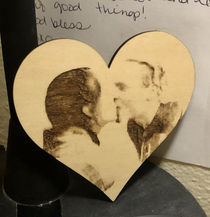 "Claire. Odds you kiss Craig through the window?" Fast forward from me losing to me having to kiss Craig through the window. Despite us being separated by a window, I still felt very uncomfortable. So now, let me tell you the worst part. David has a laser engraver where you can upload a photo and engrave a piece of wood. Very cool, until he pauses the video at the moment Craig and I 'kiss', screenshot and engraves heart-shaped wooden pictures of Craig and me kissing. And of course, you cant see that there is glass there...
